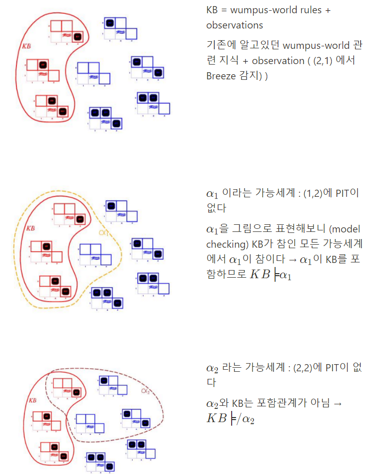 KB가 True인 가능세계에서 alpha가 항상 참일 경우 KB가 alpha라는 sentence를 entail (KB entails alpha)