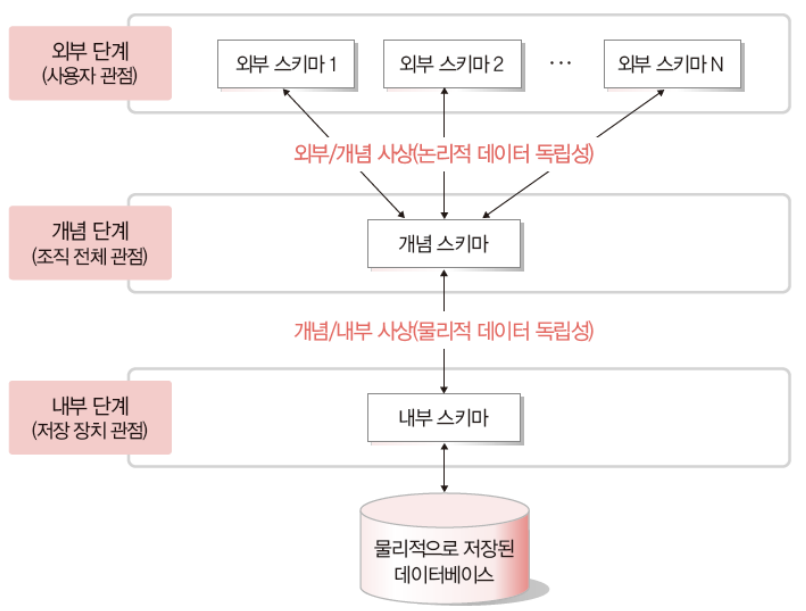 데이터베이스를 쉽게 이해하고 이용할 수 있도록 하나의 데이터베이스를 보는 관점에 따라 3단계로 나눈 것