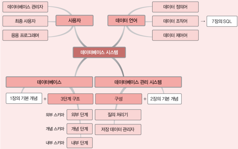 | 외부 스키마 | 외부 단계에서 사용자에게 필요한 데이터베이스를 정의한 것 | 각 사용자가 생각하는 데이터베이스의 모습(논리적 구조)이기 때문에 사람마다 다름 |